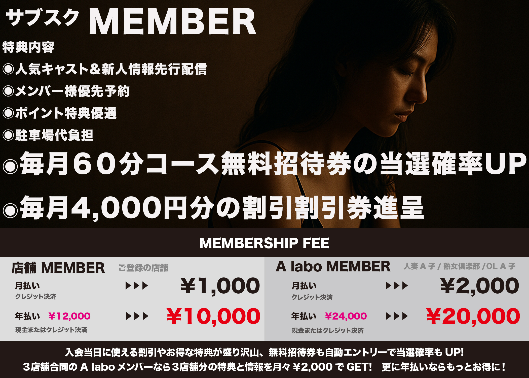 2025 10月 04日 20:35 サブスク ご好評頂いております サブスクメンバー(有料会員)を募集中! ◎お支払い方法は2種類! 『月額制』クレジット決済のみ 月額¥1,000毎月25日自動更新 『年間一括』2か月無料 年額¥12,000のところを ¥10,000円で超お得!!! ◎気になる特典内容はこちら ↓↓↓↓↓↓↓↓↓↓↓↓ ●人気キャスト&新人情報先行配信 ●会員様優先予約システム ●ポイント特典優遇 ●駐車場代負担(ご利用時間分) さらに追加特典と致しまして ★毎月無料招待券の当選確率UP! ★毎月2,000円分の割引券✖️2枚 合計4,000円分進呈! さらに!!! A laboメンバー(3店合同会員)なら 各店舗それぞれで特典が受けられます! 月々¥2,000(クレジット決済のみ) 年間払い¥20,000 ★なんと2店舗分のお支払いで 3店舗全てで特典のご利用が可能‼‼★