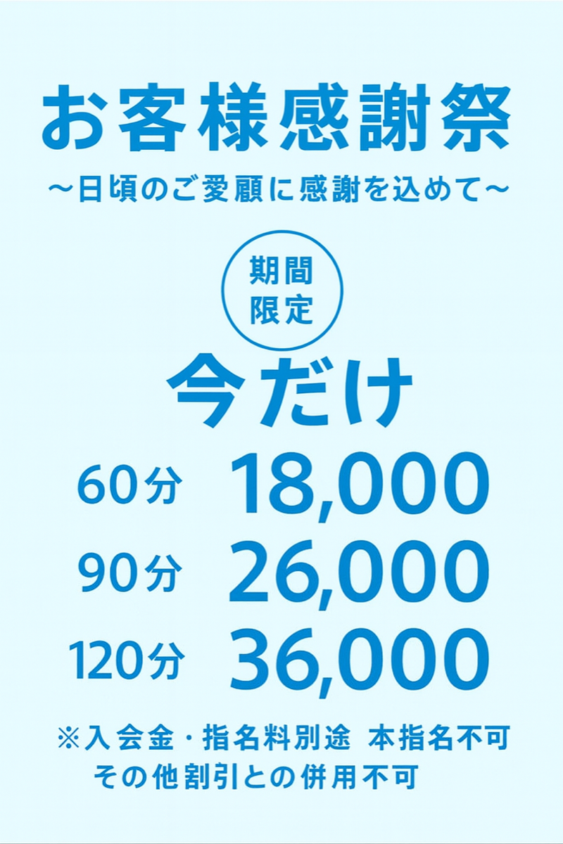 2025 9月 18日 00:00 朝割実施中 本日【朝割】実施いたします!! 8時~15時までに受付の方へ 下記の特別料金にてご案内致します。 ※本指名は対象外となります。 総勢20名からお選びいただけます。 この機会にいかがでしょうか。 人妻A子。 千葉市中央区栄町19-13 043-225-2619