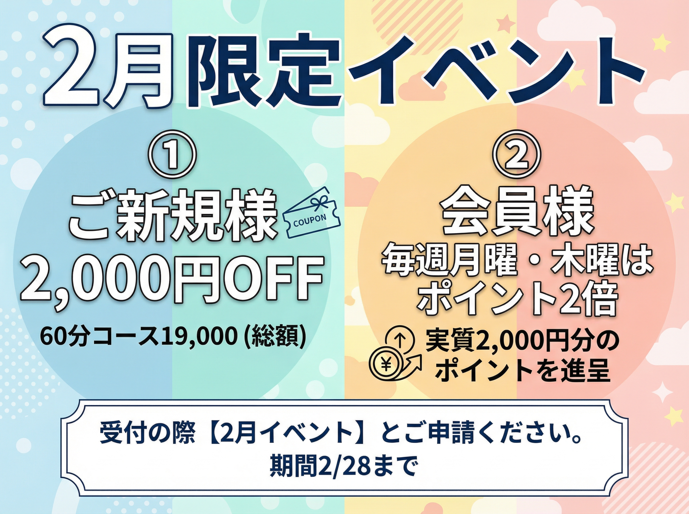 2026 2月 02日 00:30 2月イベントご案内 2月イベントのご案内です 今月はご新規様・会員様に特典をご用意しました サブスク会員様も(月)&(木)はポイント2倍です。 ※その他、割引ポイントとの併用不可 まだ人妻の蜜を知らない方 この機会にいらしてください! 2月もご来店心よりお待ちしてます。